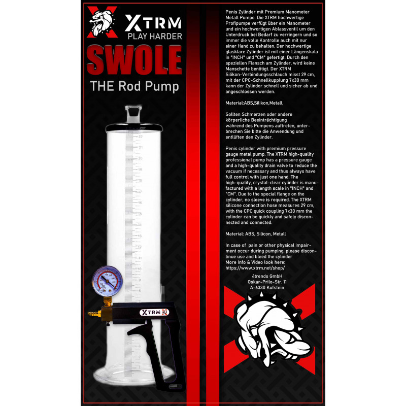 Az XTRM egy kiváló minőségű, professzionális nyomásmérővel és a legjobb minőségű leeresztő szeleppel rendelkező, férfiaknak ajánlott, hímvesszőre helyezendő henger alakú készülék, mely a hozzá kapcsolt pumpával fokozza annak vérbőségét. A vákuum intenzitása a pumpával szabályozható. Használatával az erekciós képesség fokozásán kívül a hímvessző mérete és átmérője is növelhető.
